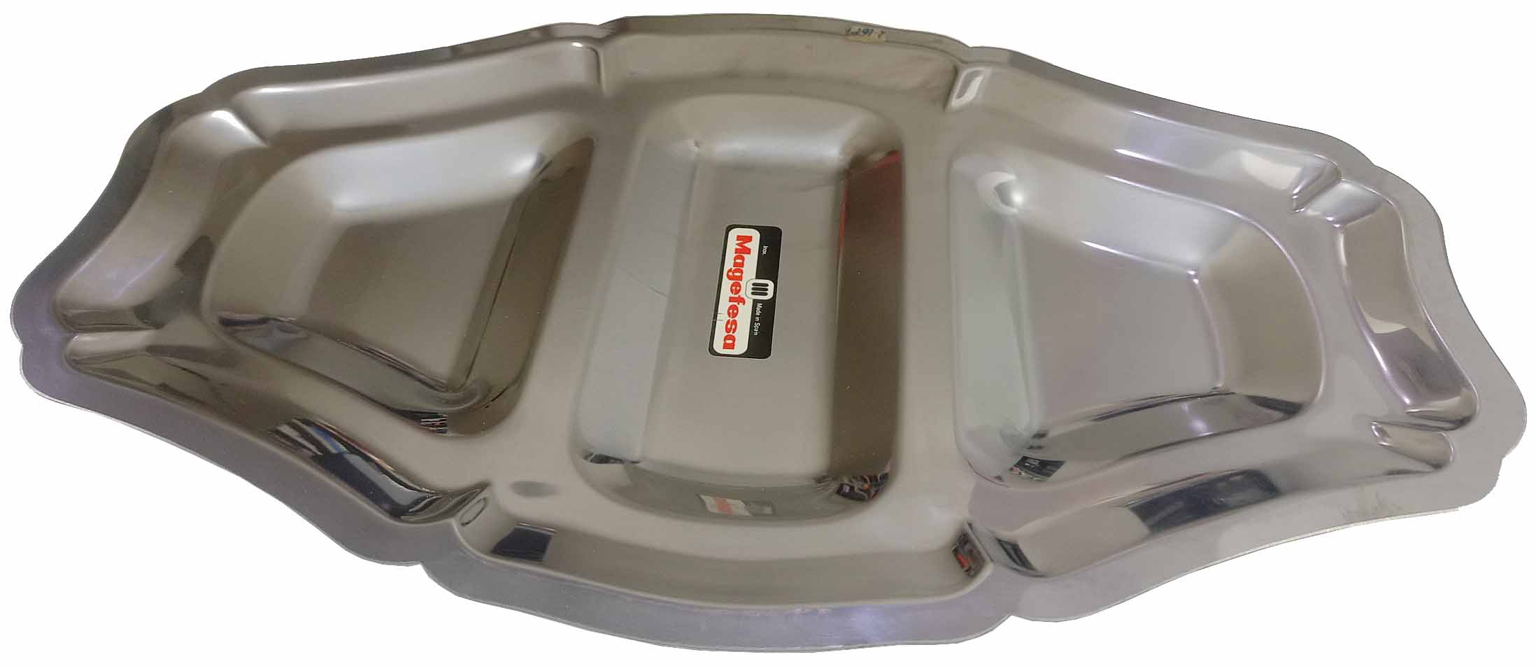 BANDEJA DE APERITIVO CON 3 HUECOS SIN ASAS METALICA CON FORMA OVALADA DE 33X21CM. DECORADA EN RELIEVE. INOXIDABLE DE MAGEFESA.