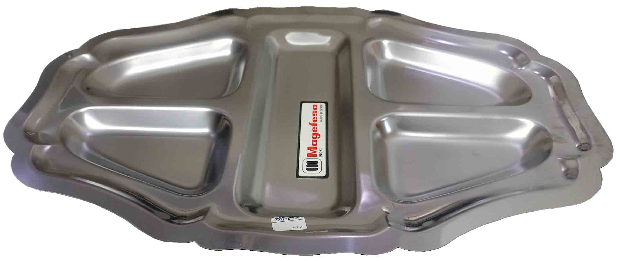 BANDEJA DE APERITIVO CON 5 HUECOS SIN ASAS METALICA CON FORMA OVALADA DE 40X26CM. DECORADA EN RELIEVE. INOXIDABLE DE MAGEFESA.