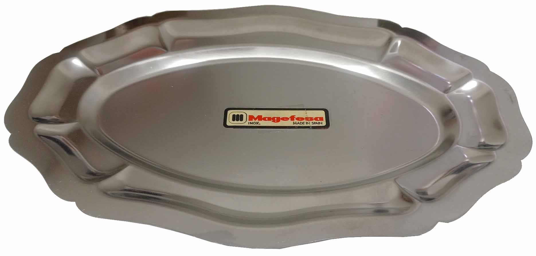 BANDEJA SIN ASAS METALICA CON FORMA OVALADA DE 25,5X17,5CM. DECORADA EN RELIEVE. INOXIDABLE DE MAGEFESA.