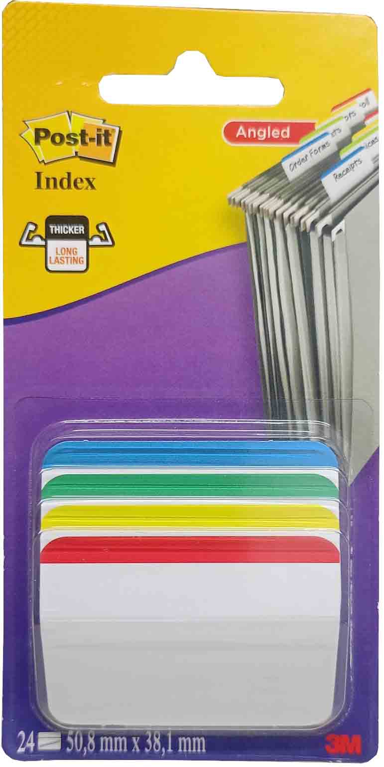 Post-it index rígidos grandes inclinados, perfectos para codificar y clasificar por colores, organizando el trabajo de forma duradera, se puede escribir sobre ellos. Blíster con 24 Marcadores con el borde en colores: 6 verdes, 6 azules, 6 rojos, 6 amarillos.