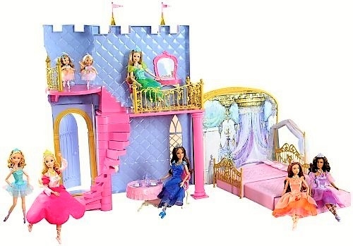 El baile de Castillo Mágico es un castillo en miniatura diseñado después del Castillo de lujo de la película. Un lado de la casa de muñecas está diseñado para tener un dormitorio y un comedor, además de una escalera de caracol que conduce al balcón del castillo. El castillo también tiene una puerta secreta que lleva al otro lado, donde otras características interesantes están instalados. Este lado también cuenta con la pista de baile donde las muñecas pequeñito podía bailar en torno a tono con la música. El baile Castillo Mágico también cuenta con un estante de maquillaje, un juego de té en miniatura y algunas almohadas de lujo. MUÑECAS NO INCLUIDAS.