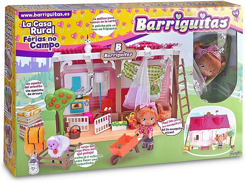 ¡Las muñecas Barriguitas se van de vacaciones a una Casa Rural! Qué divertido es pasar un día en el campo, jugando con los animales. Podrás cocinar los huevos que ha puesto la gallina, hacer queso parmesano con la leche de la oveja, y si tienes frío hacerte una chaqueta con la lana. Pero cuidado con los mosquitos que te quieren picar!.