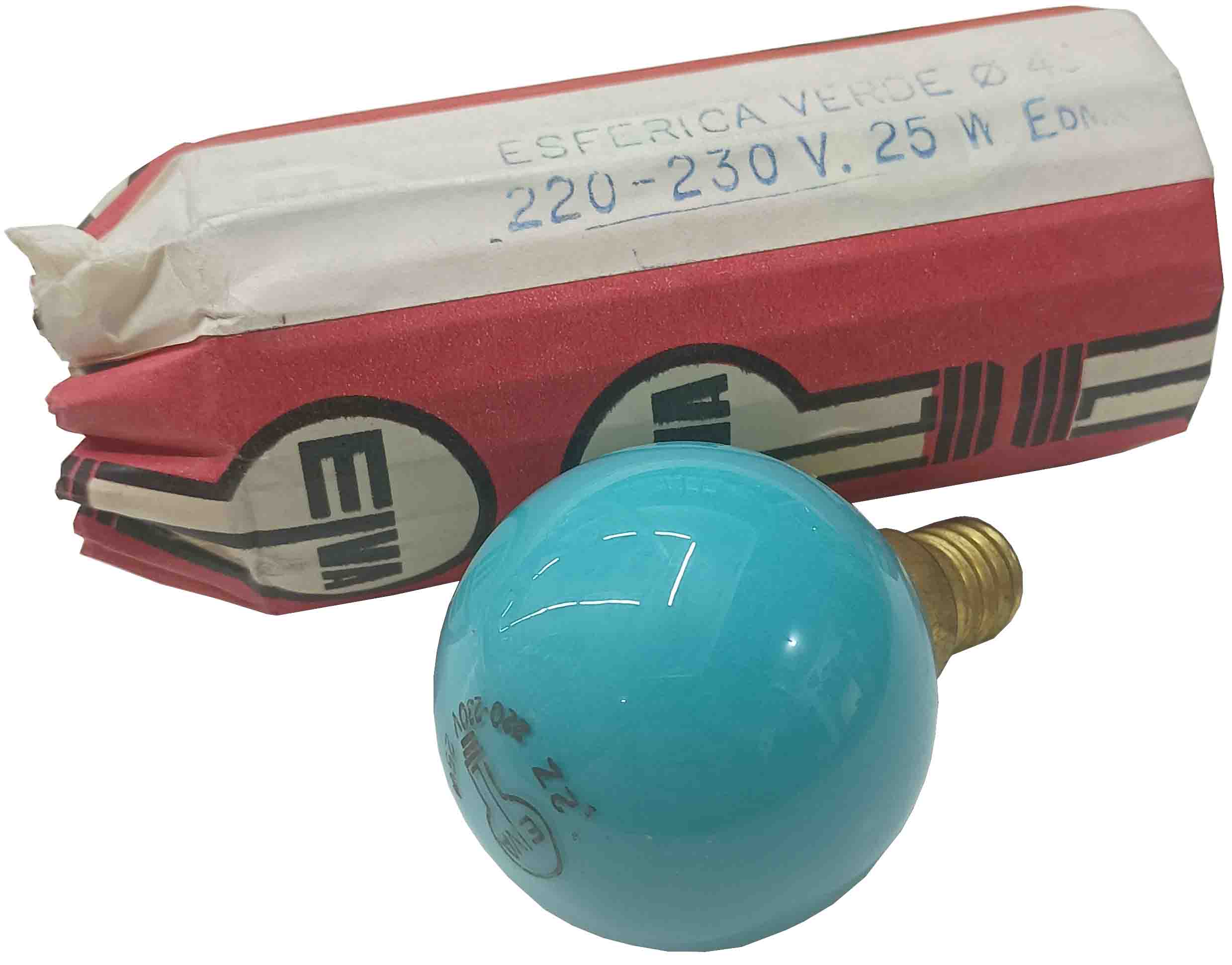BOMBILLA INCANDESCENTE DE 220V. 25W. CASQUILLO DE E-14. Ø 45MM. ESFERICA DE COLOR VERDE. MARCA ELVA.