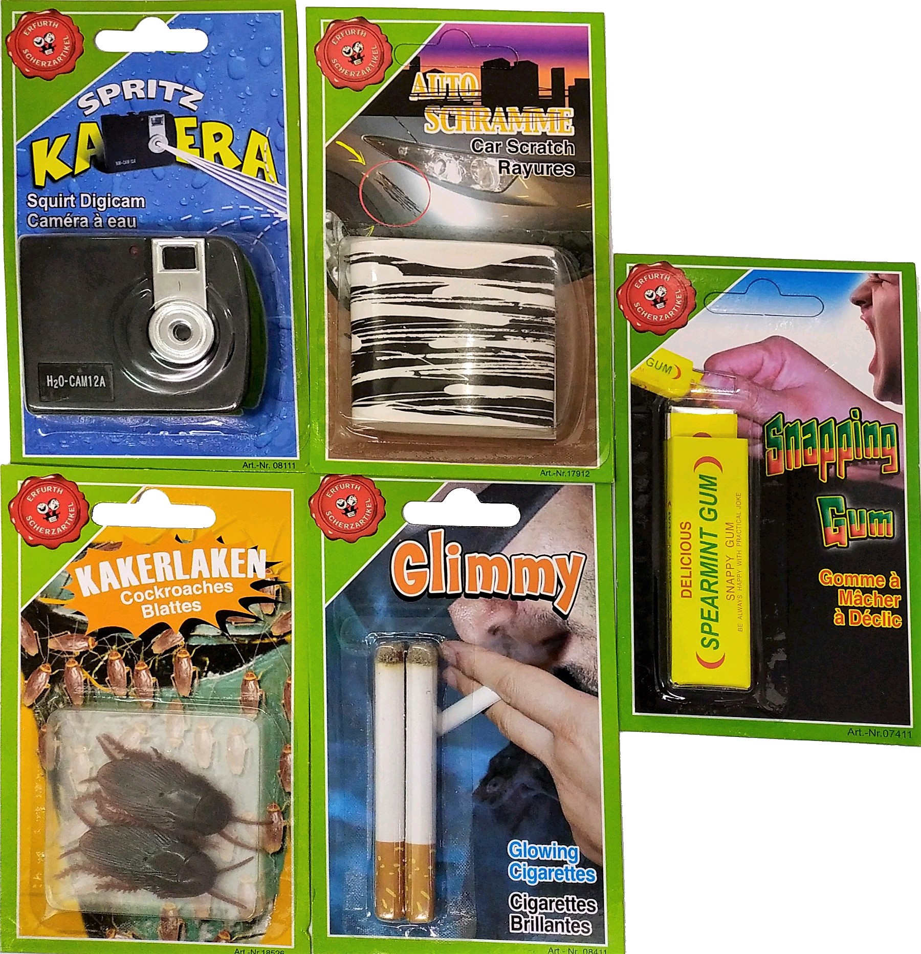 Blister surtidos: Cigarrillos ardientes. Chicles picantes. Cucarachas gigantes asquerosas. Camara digital con chorro de agua. simulador de rayadura de coches. CONSULTAR DISPONIBILIDAD DEL MODELO. PRECIO POR UNIDAD.