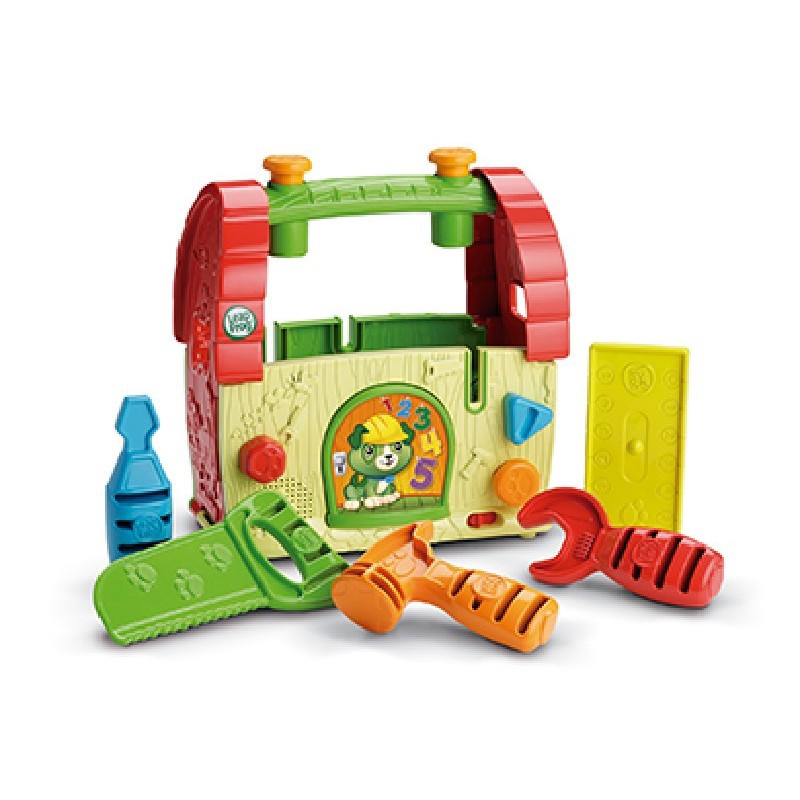 Caja de herramientas con forma de casita, para montar y desmontar siguiendo las instrucciones de audio y usando las herramientas incluidas. Enseña colores, a contar, resolver problemas y más.