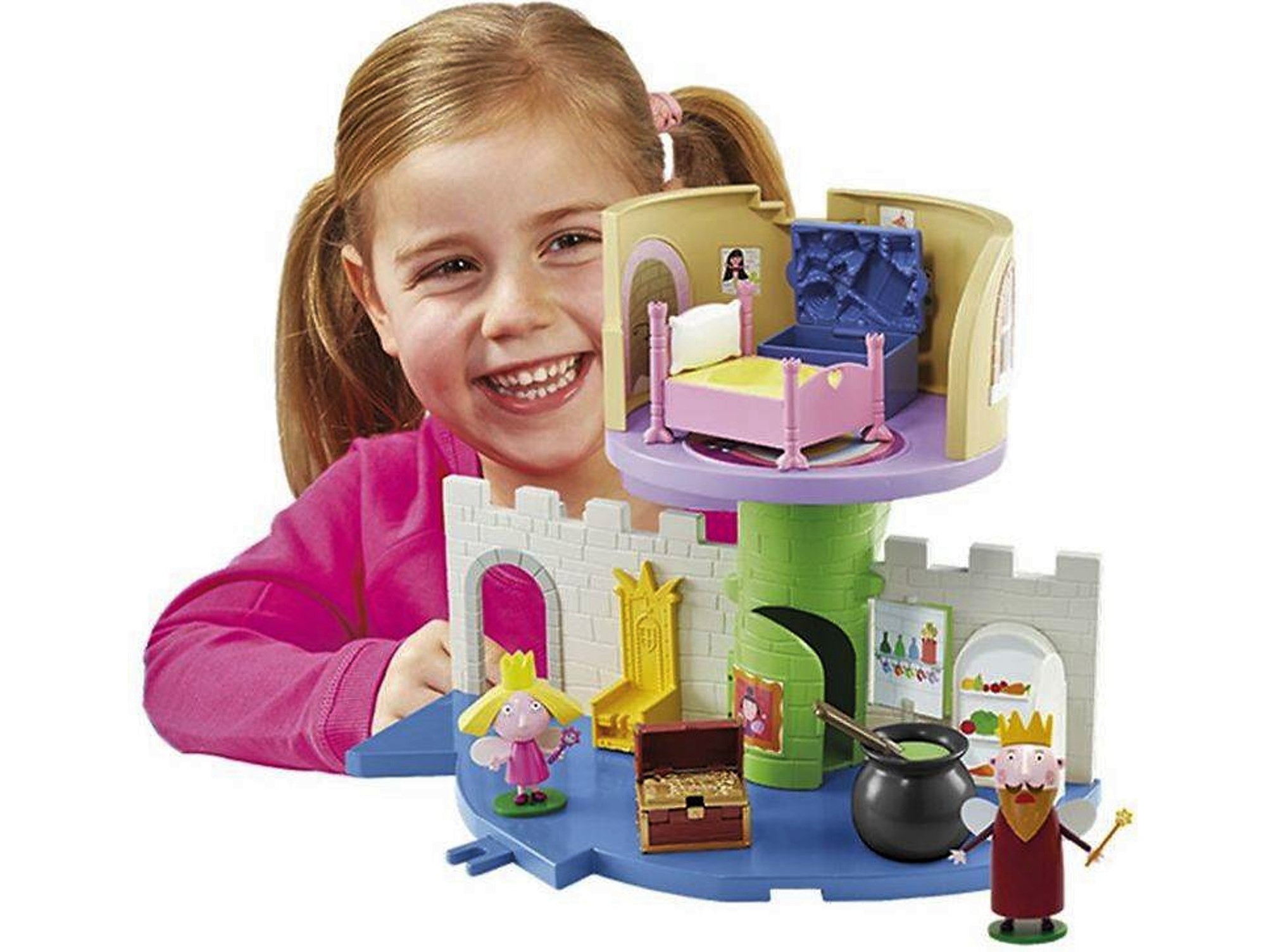 Ben & Holly Castillo con 2 Figuras Exclusivas . ¡Adéntrate en la aventura mágica del nuevo castillo del Rey! Ayúda a Holly a abrir la tapa del cofre del tesoro para revelar el tobogán que se conecta a la habitación secreta de abajo. Mira cómo sube y baja el trono, ¡es un trono flotante! Agita la cuchara en el Caldero y… ¡se abre la nevera!