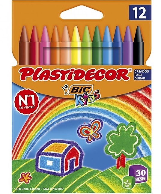 Lápices cera plastidecor caja de 12 colores. Los colores se pueden mezclar entre sí. No se rompen. Se pueden borrar. Indicados para uso escolar. Se les puede sacar punta. No ensucian.