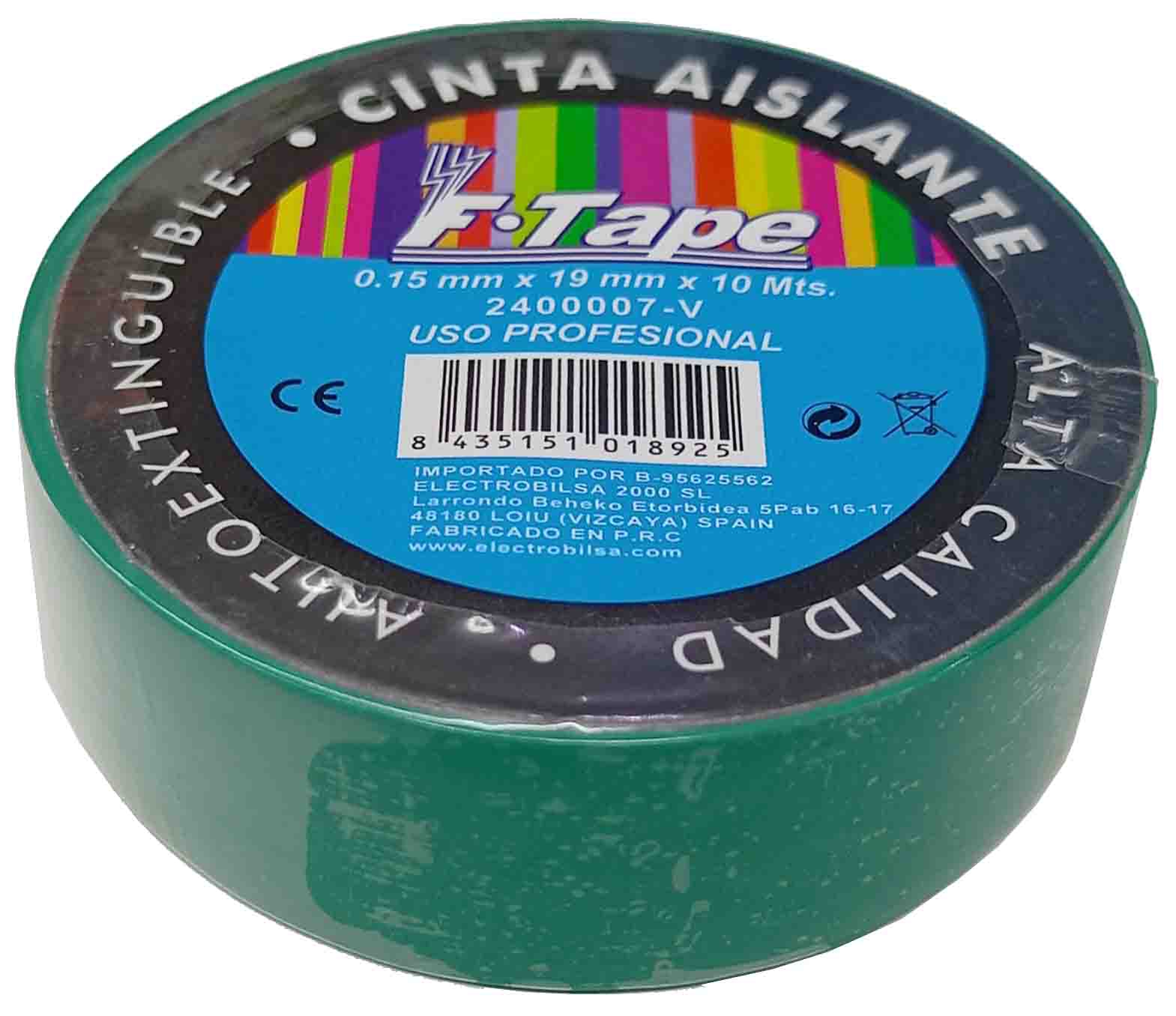 CINTA AISLANTE DE PVC DE 10MTSX19MM COLOR VERDE USO PROFESIONAL. MARCA FTAPE 2400007-V