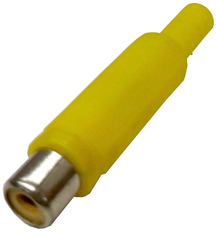 Conector aéreo tipo RCA HEMBRA con carcasa de plástico de color AMARILLO para hacer una extensión de audio y/o video. El conector RCA (Radio Corporation of America) es un conector utilizado para transportar señales de video o de audio. Los colores del conector indican cómo se debe usar.