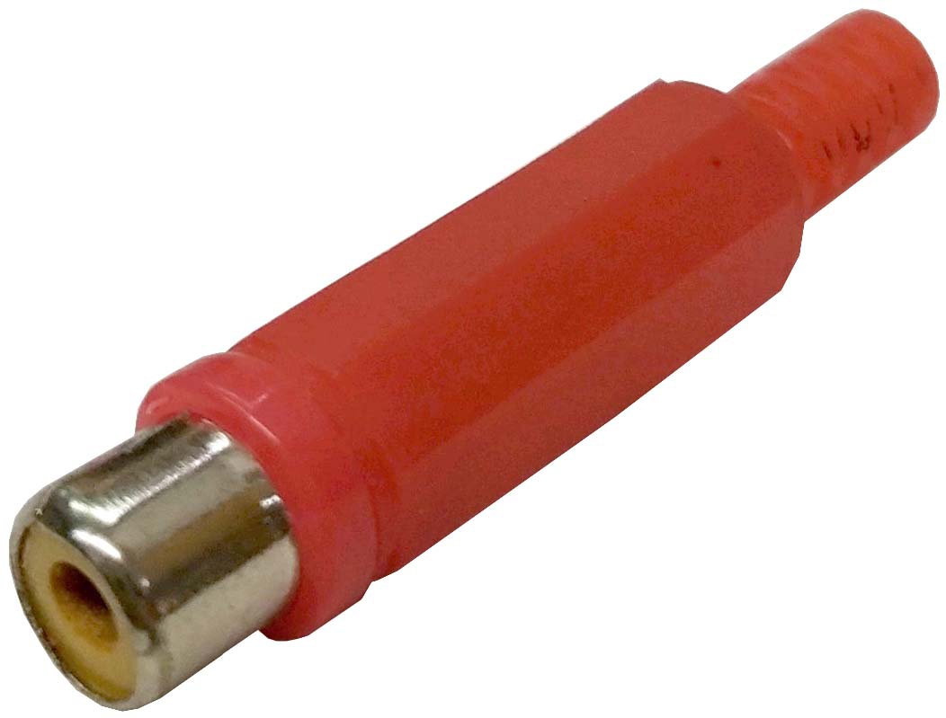 Conector aéreo tipo RCA HEMBRA con carcasa de plástico de color ROJO para hacer una extensión de audio y/o video. El conector RCA (Radio Corporation of America) es un conector utilizado para transportar señales de video o de audio. Los colores del conector indican cómo se debe usar.