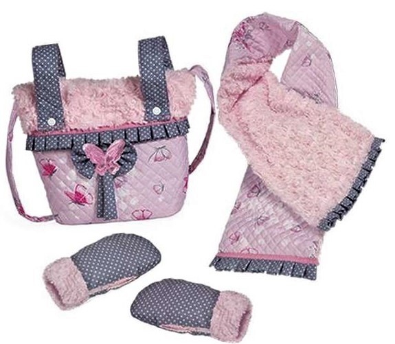 Precioso set de complementos de invierno de la colección María compuesto por un bolso, bufanda y manoplas de color azul y rosa con lazo y adorno de mariposa. Este set es ideal para ir a juego con tus muñecas.
