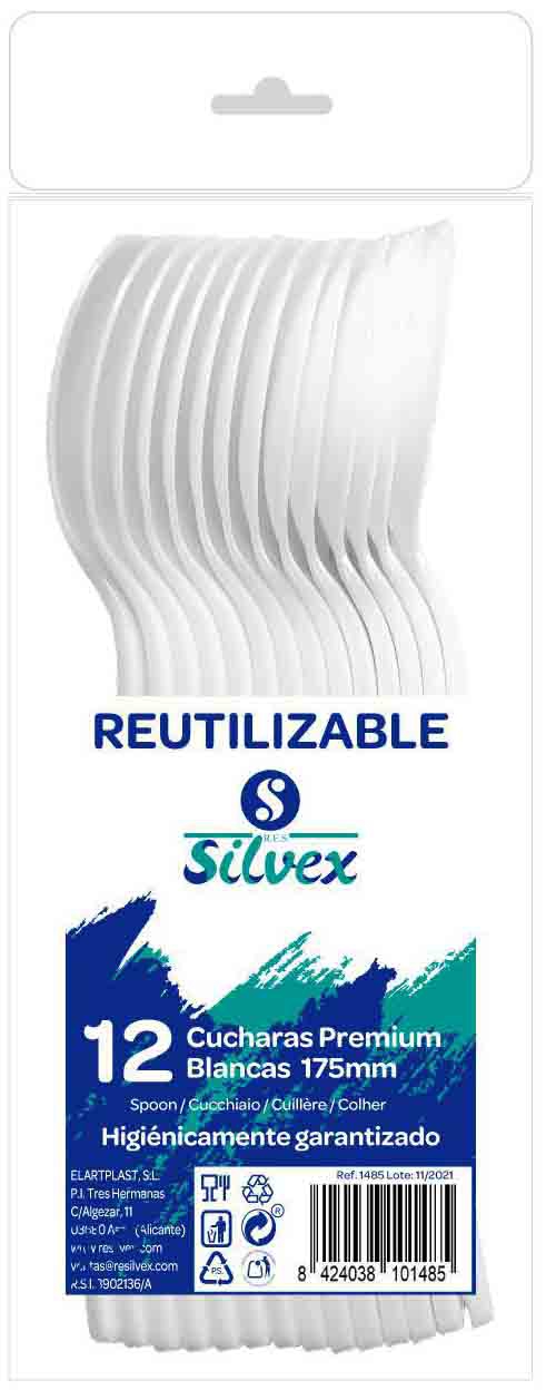 CUCHARA DE PLASTICO REUTILIZABLE DE 17,5CM PREMIUM BLANCA EN PACK DE 12 UNIDADES. DE SILVEX 1485.