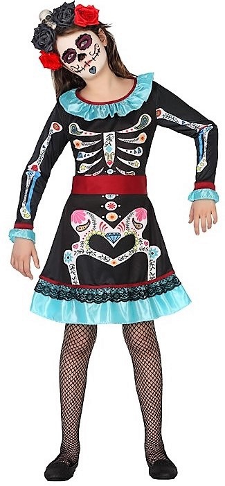 DISFRAZ DE TRAJE DE CATRINA ESQUELETO DE NIÑA TALLA DE 3 A 4 AÑOS CONTIENE VESTIDO Y CINTURON. 34709. POR MOTIVOS SANITARIOS ESTE PRODUCTO NO ADMITE DEVOLUCIONES.
