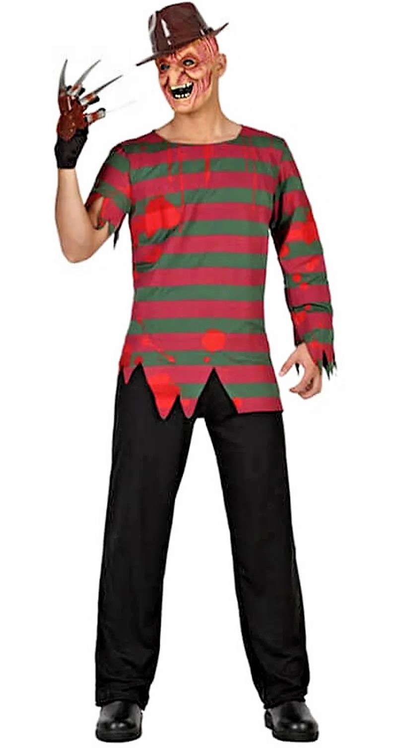 Disfraz del Freddy Krueger a rayas para hombre. . Incluye camiseta y pantalón. Resto de complementos NO incluidos. POR MOTIVOS SANITARIOS ESTE PRODUCTO NO ADMITE DEVOLUCIONES.