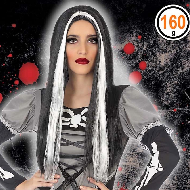 Completa tu disfraz para Halloween con esta Peluca Negra y Blanca. De 60 cm de largo en color negro con mechas blancas, ideal para Bruja.  POR MOTIVOS SANITARIOS ESTE PRODUCTO NO ADMITE DEVOLUCIONES.