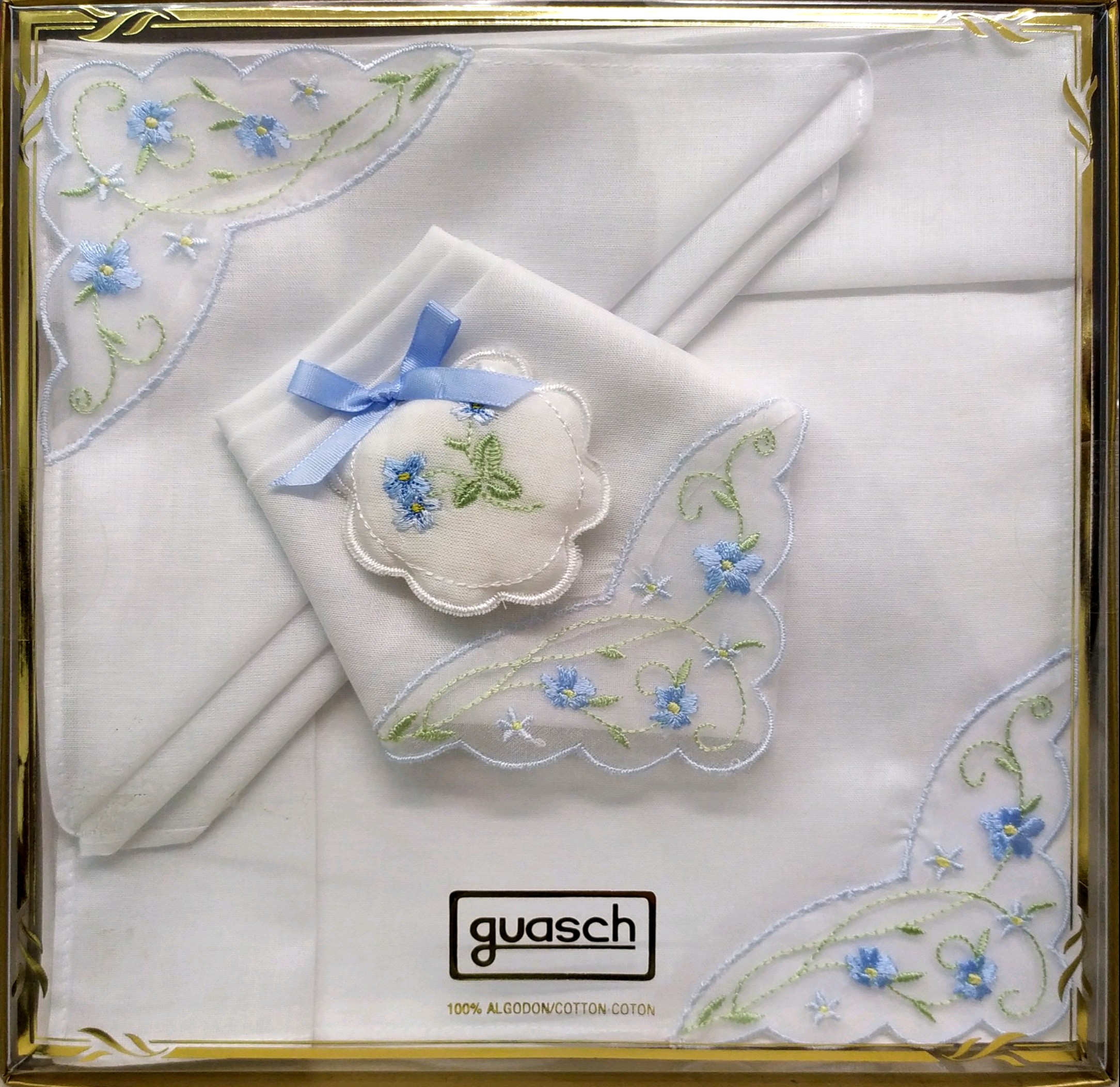 Estuche con pañuelos para mujer, blancos bordados. Los motivos bordados con flores en tonos azules, narajas y rosas, según modelo. Composición: 100% algodón. Presentación en estuche cuadrado con tapa transparente con logo de la marca. CONSULTAR DISPONIBILIDAD DEL MODELO. PRECIO POR UNIDAD.