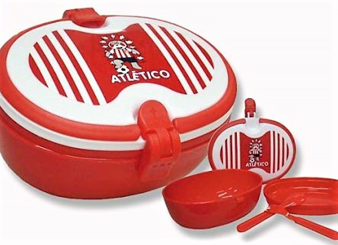 Tartera. Con cierre hermetico y asas para facilitar su transporte. Contiene plato hondo, plato llano, cuchara y tenedor. Producto oficial Atlético de Madrid. PRECIO POR UNIDAD.