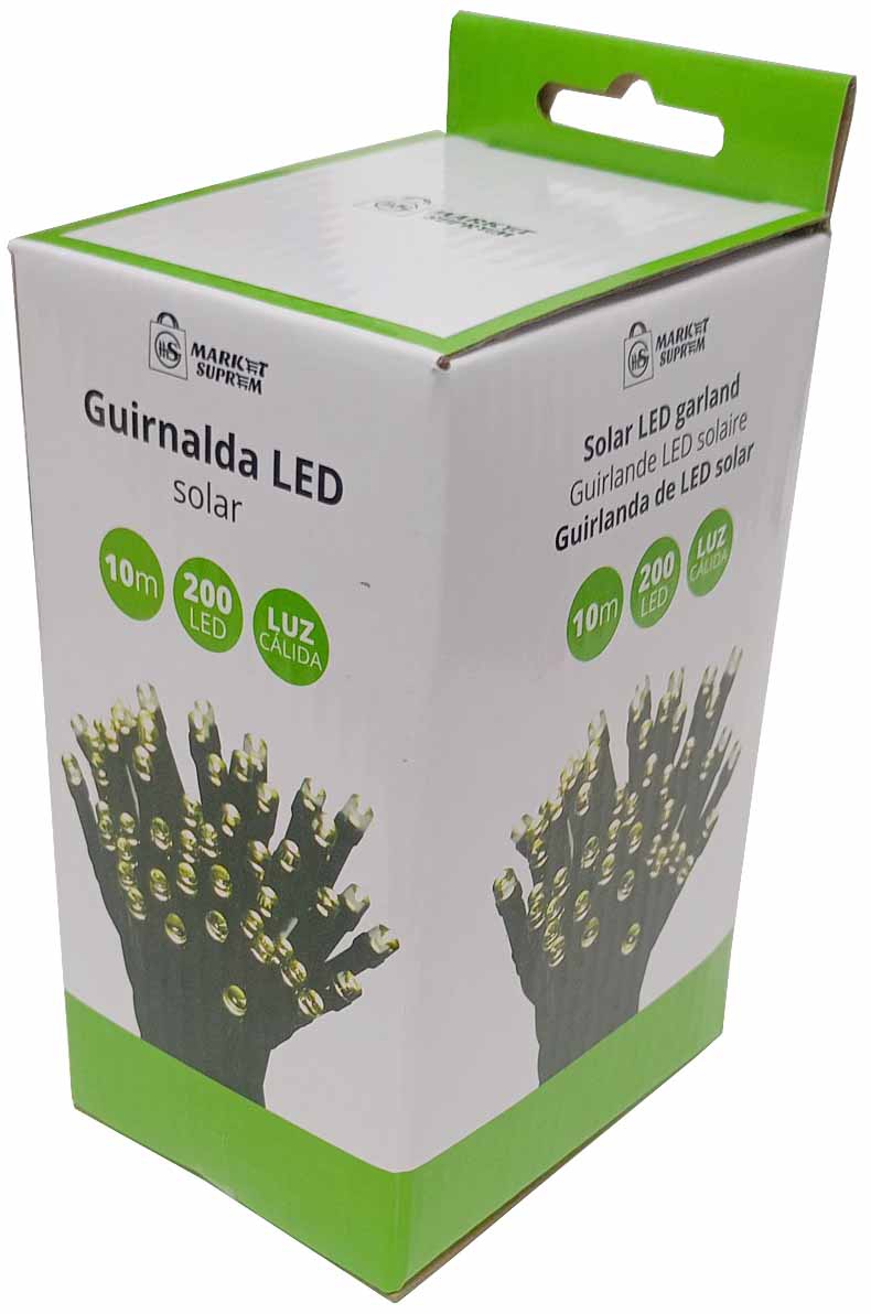 GUIRNALDA DE LUCES LED SOLAR DE 10M. Y 200 LED DE LUZ CALIDA. ESTA LUMINARIA ALMACENA ENERGIA CUANDO RECIBE LUZ SOLAR. UNA VEZ DEJA DE RECIBIR LUZ SOLAR, LOS LED SE ILUMINAN AUTOMATICAMENTE.