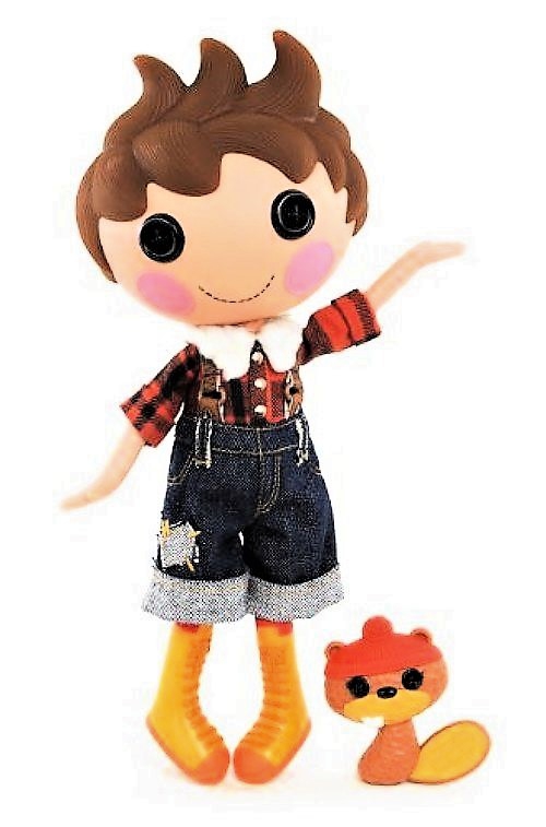muñeca con ojos de botón, pelo de lana, piernas largas y a va acompañada por su propia mascota.