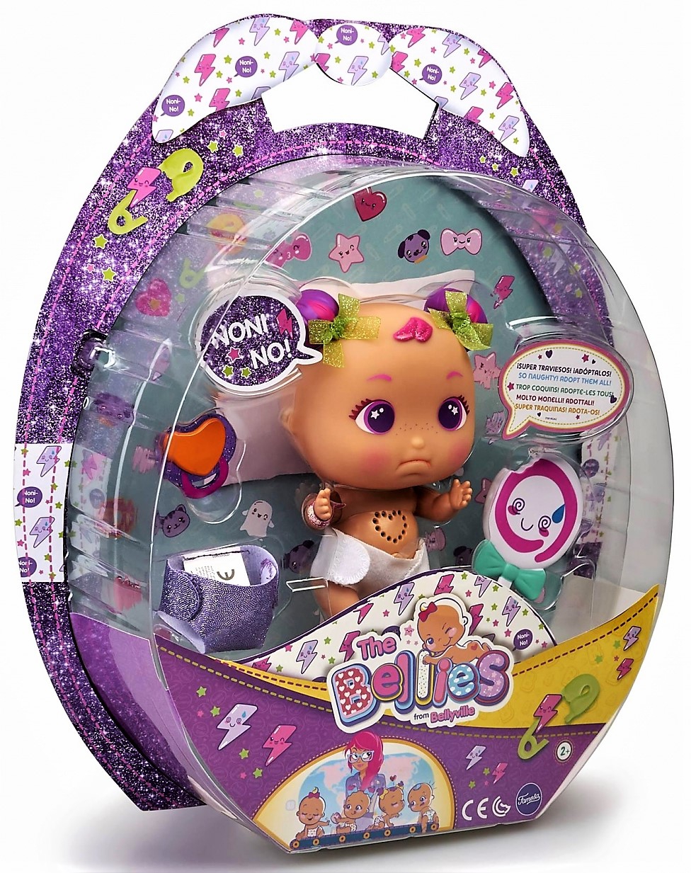 Los Bellies son los muñecos más revoltosos, traviesos y divertidos listos para adoptar, cada Bellie tiene su propia personalidad. Noni No es la más gruñona, divertida y traviesa. Tiene dos moñitos violeta con un lacito verde e incluye un precioso pañal de purpurina color morado. Están llenos de sorpresas: al quitarle el cordón umbilical escucharás el latido de su corazón, después, Noni No comenzará a hablar en su propio idioma; tiene una preciosa marca de nacimiento que descubrirás al quitarle su pañal. Consulta la Poopypedia en la Bellypedia para ver qué cuidados necesita tu Bellie.
