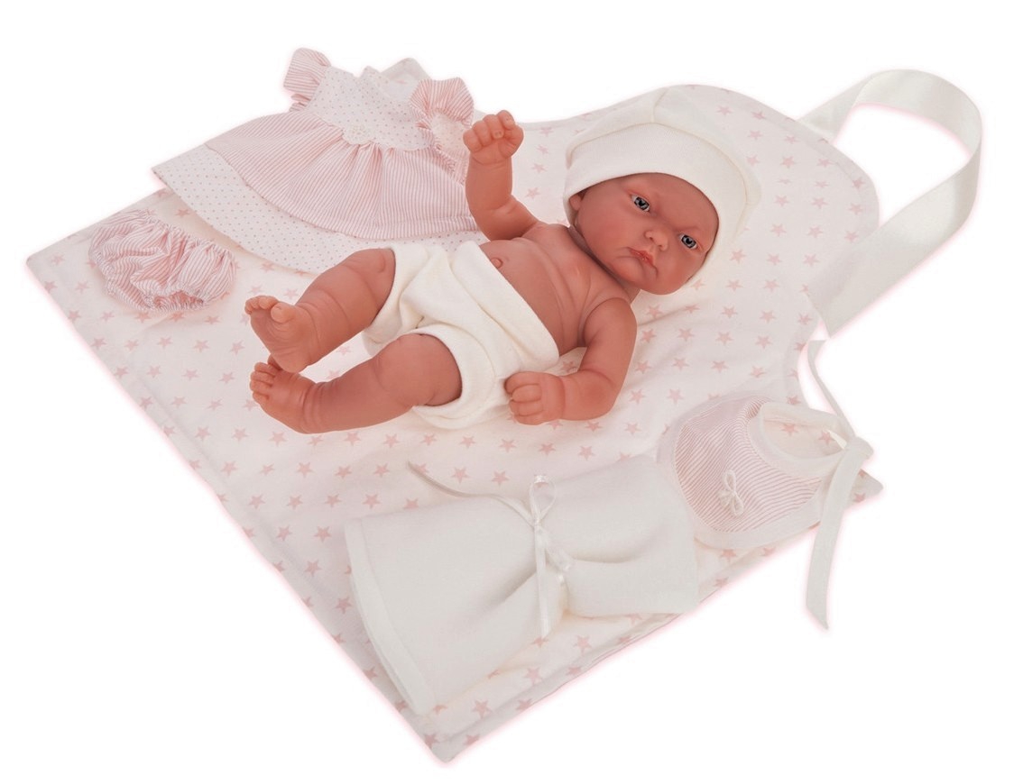 Muñeco de 26 cm con todo el cuerpo articulado de vinilo. Incluye cambiador, conjunto, mantita. Edad indicada +3 años. PRECIO POR UNIDAD.