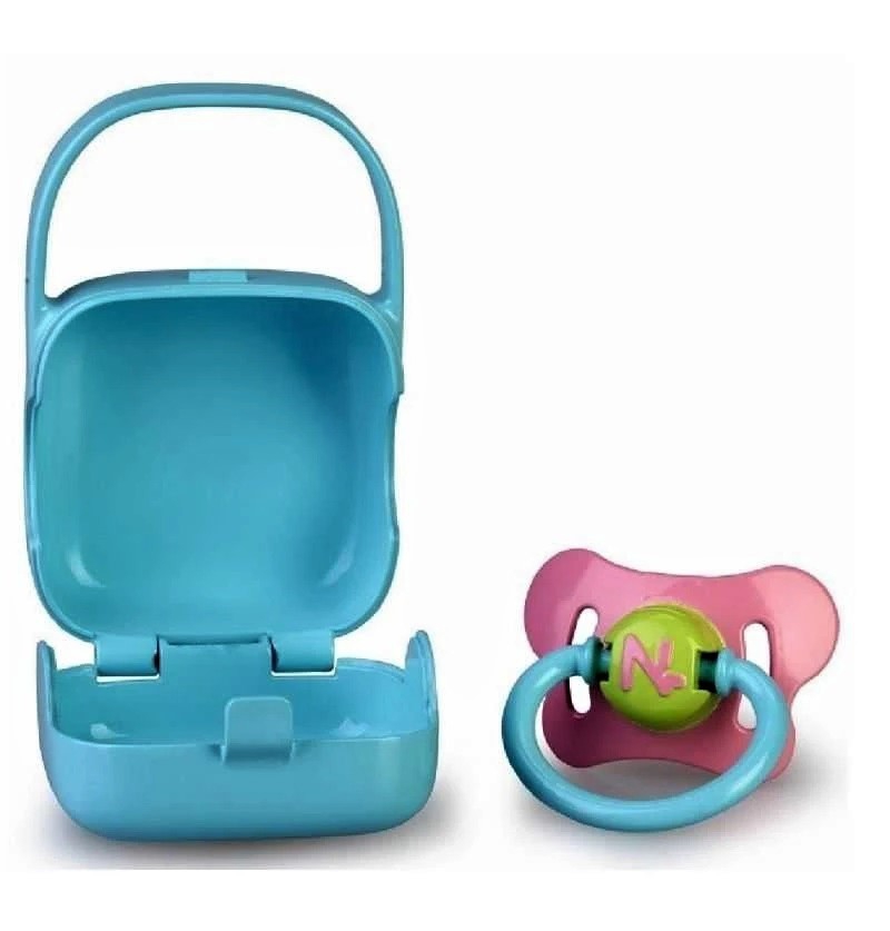 Divertido Chupete para Muñeco Nenuco de color rosa con aro azul, incluye un gracioso Portachupetes de color Azul muy practico para guardarlo y que no se ensucie, con ilustraciones de unas nubes. Edad a partir de 1 año.