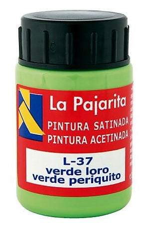 PINTURA A BASE DE LATEX COLOR VERDE LORO. BOTE DE 35ML LA PAJARITA. Pintura a base de látex de acabado satinado. Se aplica directamente sobre madera, papel, piedra, ladrillo, estuco, cemento, etc. Basta con enjuagar los utensilios empleados con agua tras finalizar el trabajo. Bote de 35 ml.