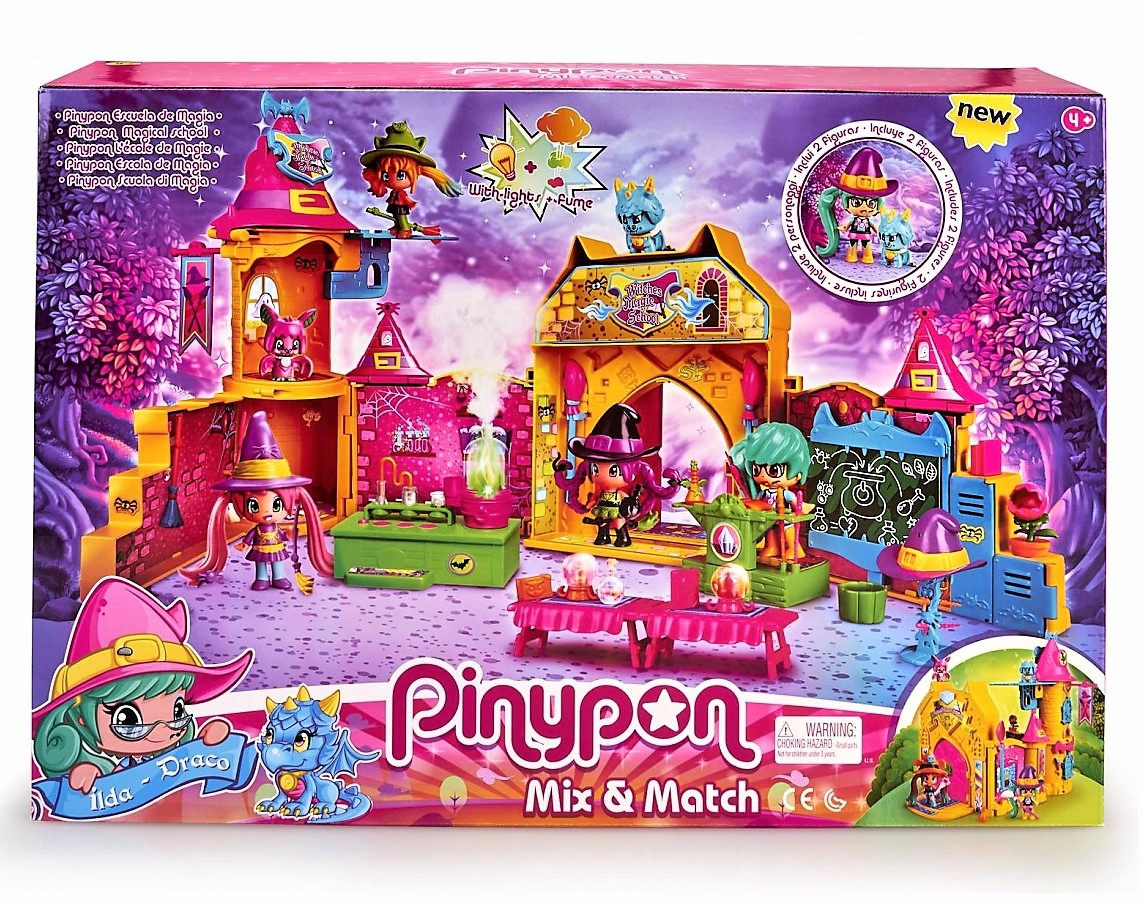 La escuela de magia de las brujitas pinypon está llena de magia: la puerta de entrada se abre mágicamente con la escoba y algunas trampas protegen los secretos más preciados del mundo mágico; la escuela cuenta con: clase de pociones con humo y luces de verdad, clase de herbología, clase de adivinación con bolas para leer el futuro, clase para aprender a volar las escobas y clase de adiestramiento de mascotas mágicas; también hay un sombre especial mágico para la graduación de las alumnas brujitas; el juguete mide unos 60 x 38 x 15 cm aprox; incluye 1 brujita nueva con su mascota dragón.