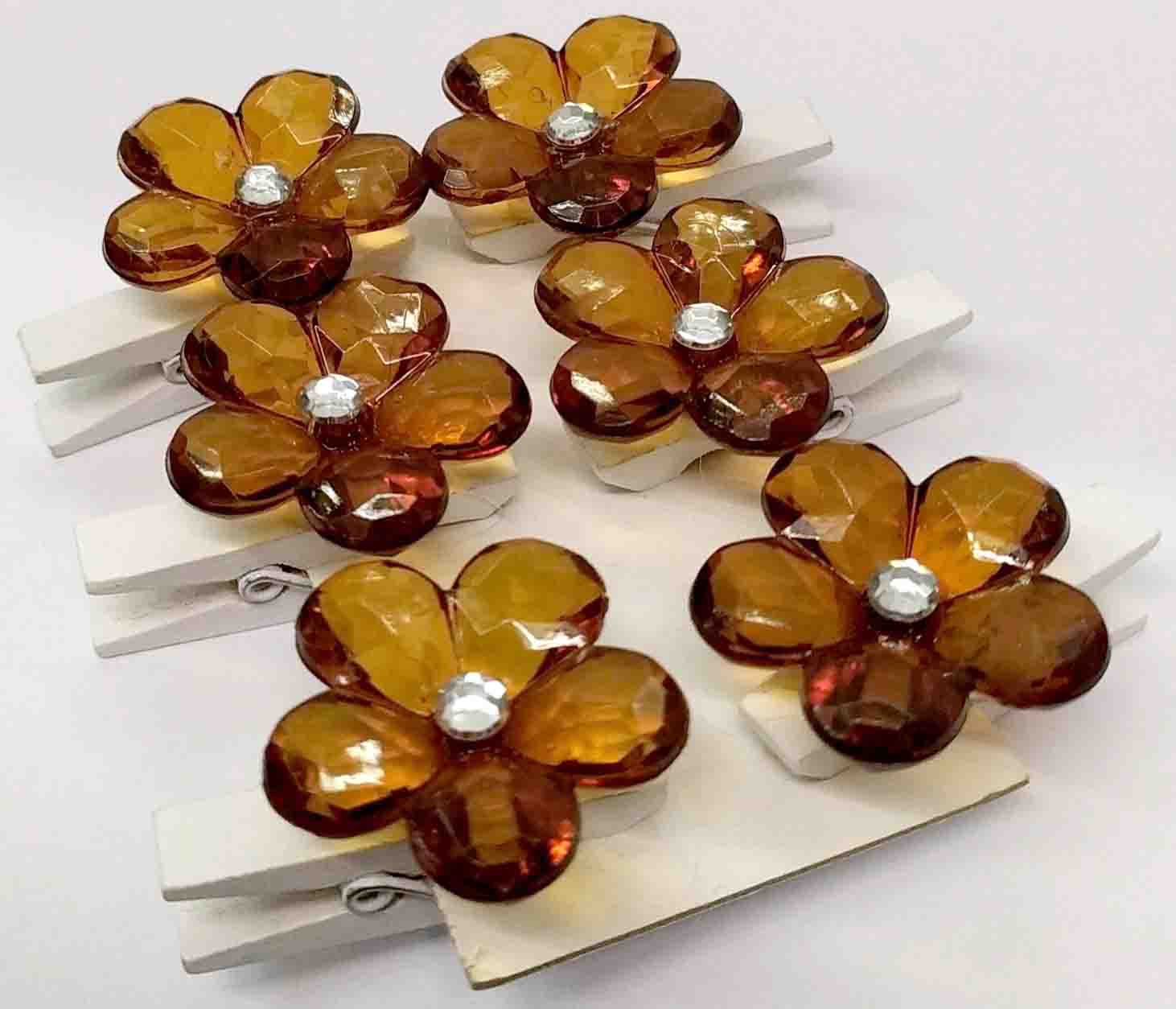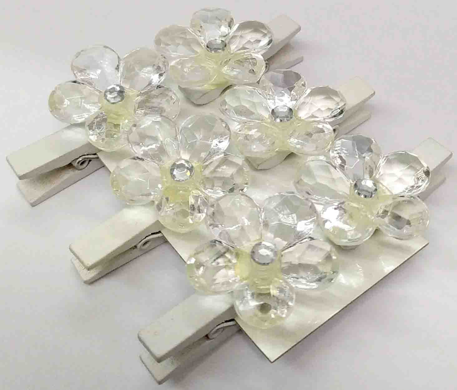 PINZAS MINI DE MADERA BLANCA CON FLOR DE COLORES EN PAQUETES DE 6 UNIDADES.