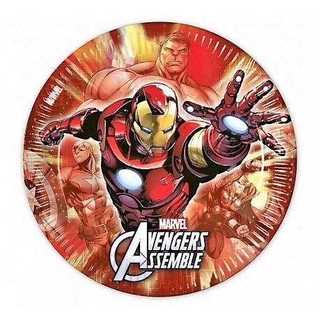PLATO DE CARTON DE LOS VENGADORES DE 22.5CM. EN PAQUETES DE 8 UNIDADES.