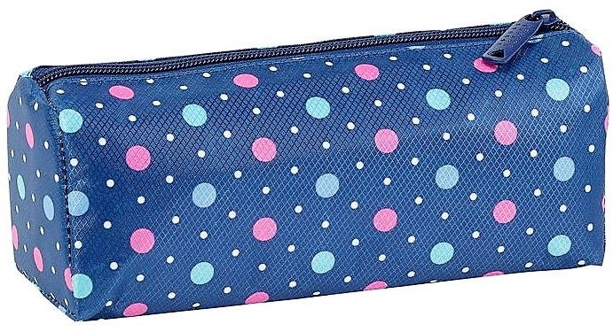 Portatodo de una sola cremallera con fondo azul y divertido estampado de lunares de colores.