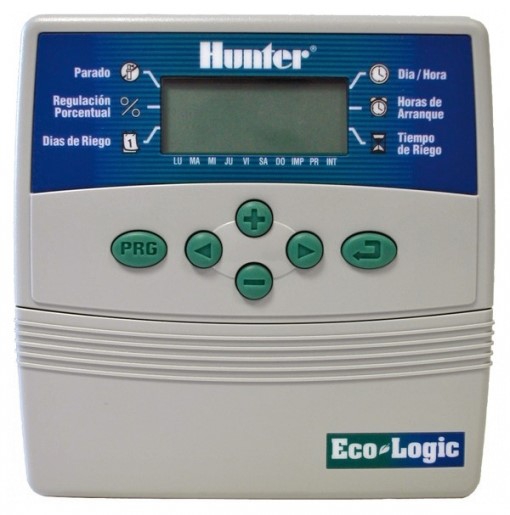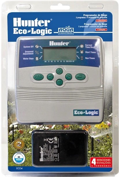 Programador de riego de 4 estaciones Hunter Eco-Logic Eco4. – 4 estaciones con dos programas y 4 arranque por programa. – Posibilidad de conectar un sensor de lluvia y activar una electroválvula maestra. PRECIO POR UNIDAD.