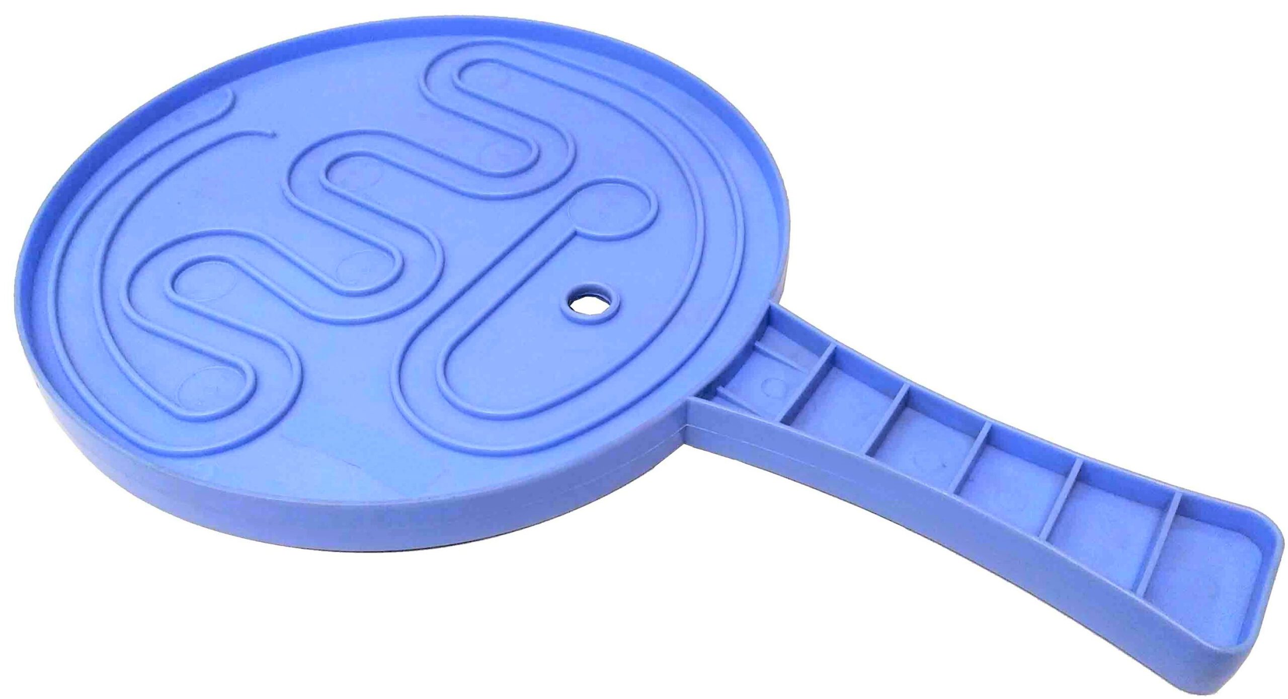 RAQUETA DE PLASTICO AZUL CON LABERINTO DISTINTO POR AMBAS CARAS. PRECIO POR UNIDAD.