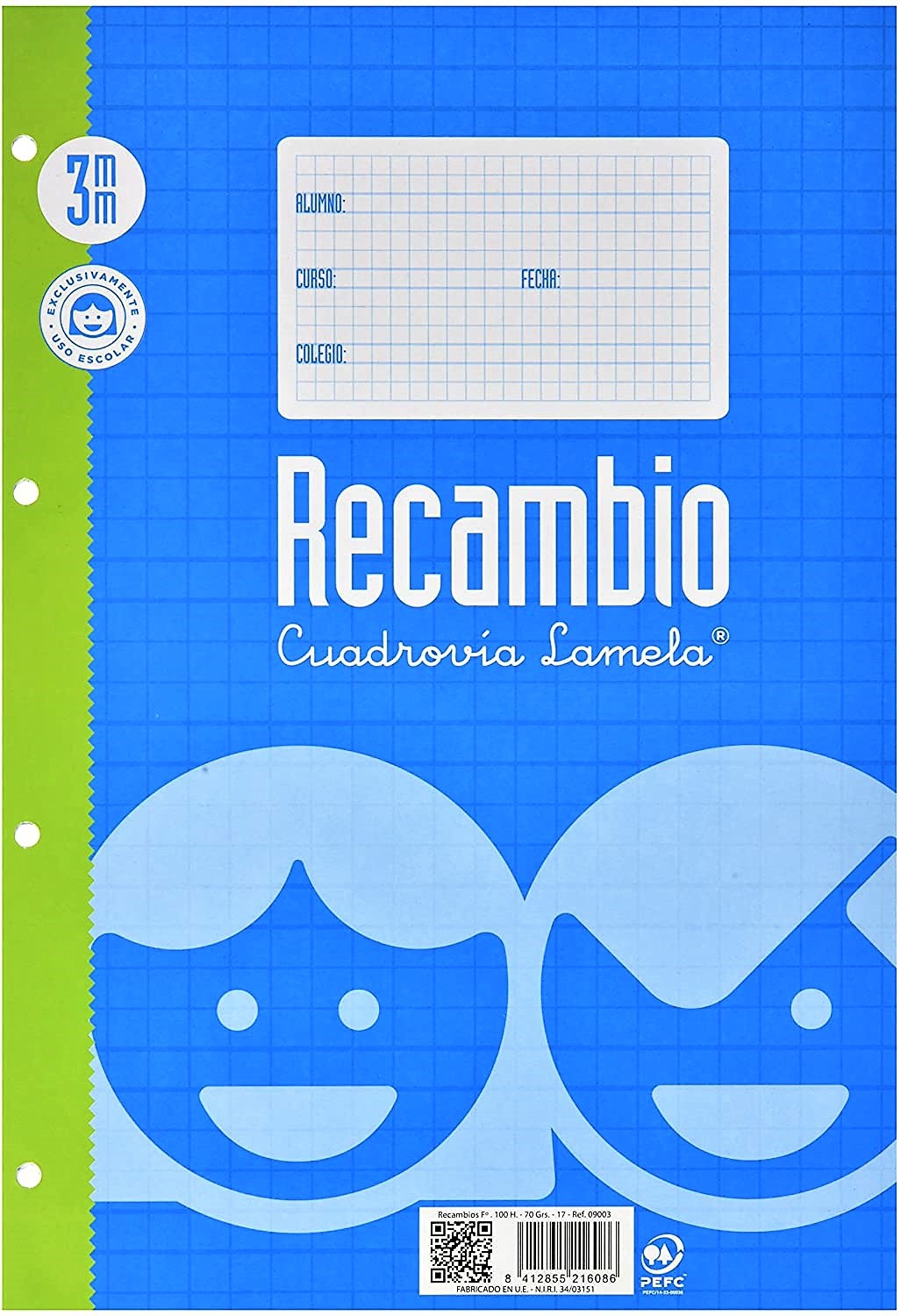 Recambio para archivador de 4 taladros, tamaño folio con diseño de Cuadrovía de 3mm. Contiene 100 hojas de papel Offset blanco extra de 70 g/m con margen. Para mostrarte dónde debes escribir. PRECIO POR UNIDAD.