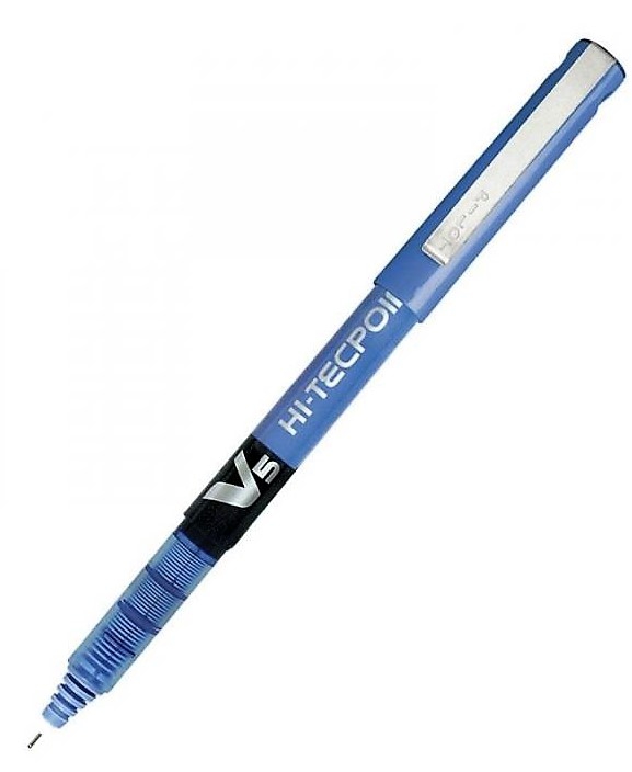 Roller de tinta líquida de color azul V5 con punta de aguja, bola de ø 0,5 mm. y ancho de trazo de 0,3 mm. Escritura suave y tanque de gran capacidad con zona transparente que permite la visión del nivel de tinta. Marca Pilot
