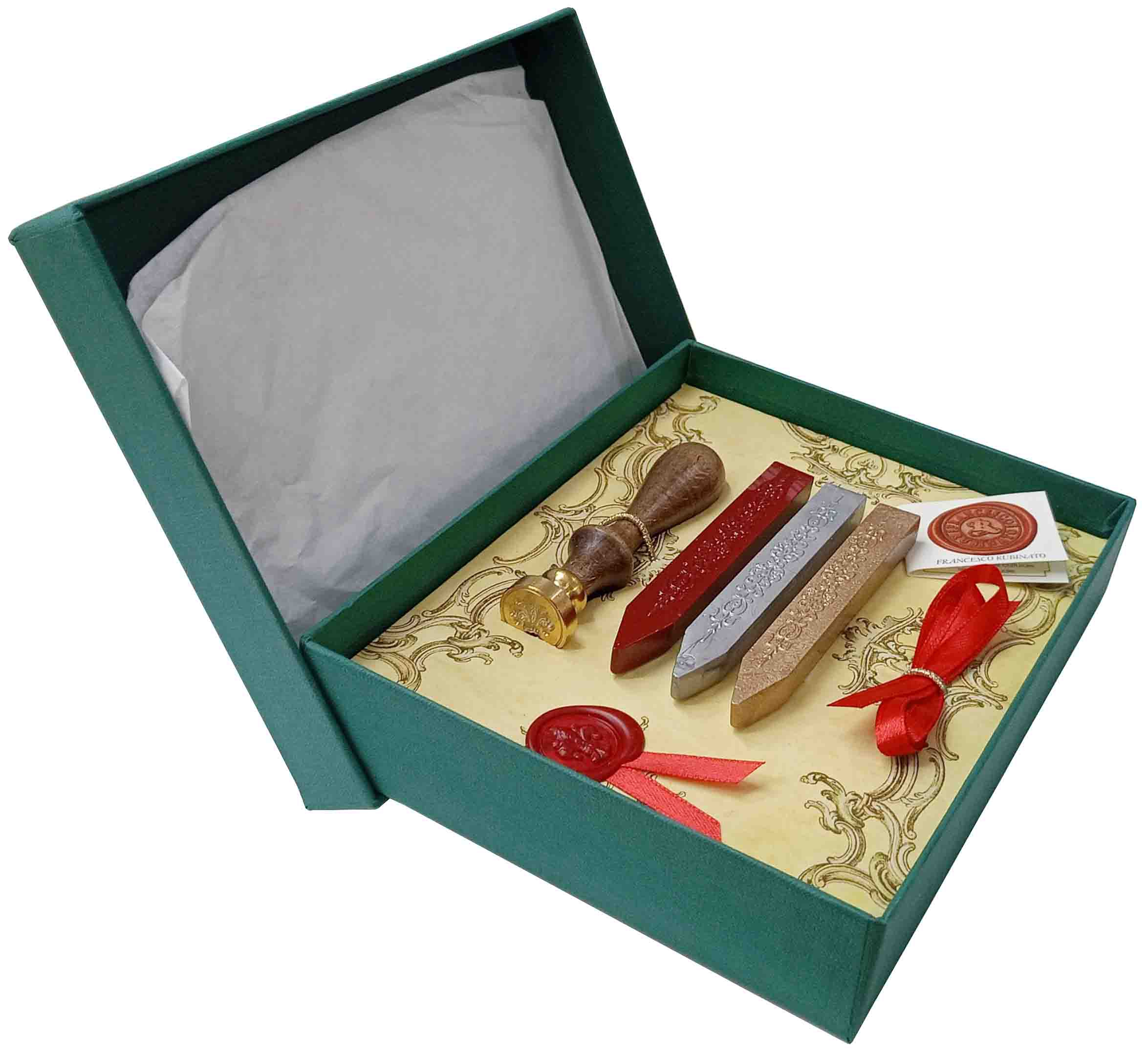 Sello de latón con mango de madera, 3 barras de cera tradicionales, cinta roja para sellar el sello