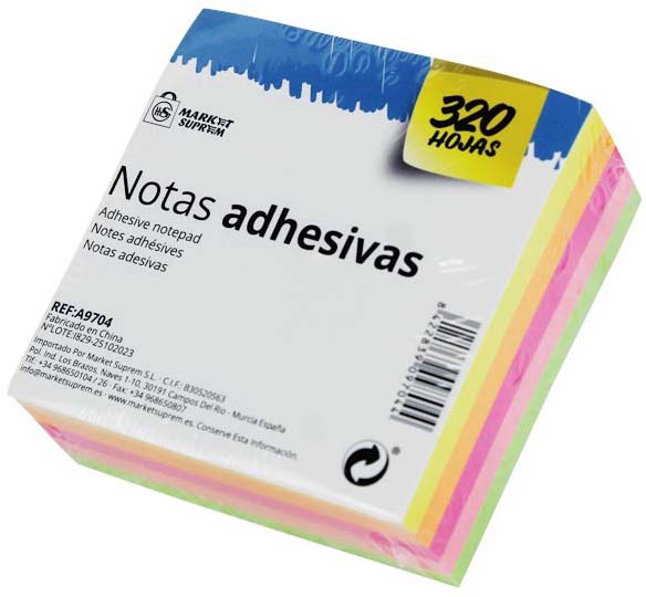 TACO DE NOTAS ADHESIVAS DE QUITA Y PON DE COLORES FLUORESCENTES MEDIDAS 76X76MM Y 320 UNIDADES DE MARKET SUPREM A9704.