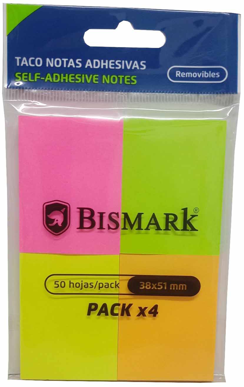 TACO DE NOTAS AUTOADHESIVAS DESPEGABLES DE QUITA Y PON DE 38X51MM Y 4X50 UNIDADES DE COLORES FLUORESCENTES DE BISMARK 921091.
