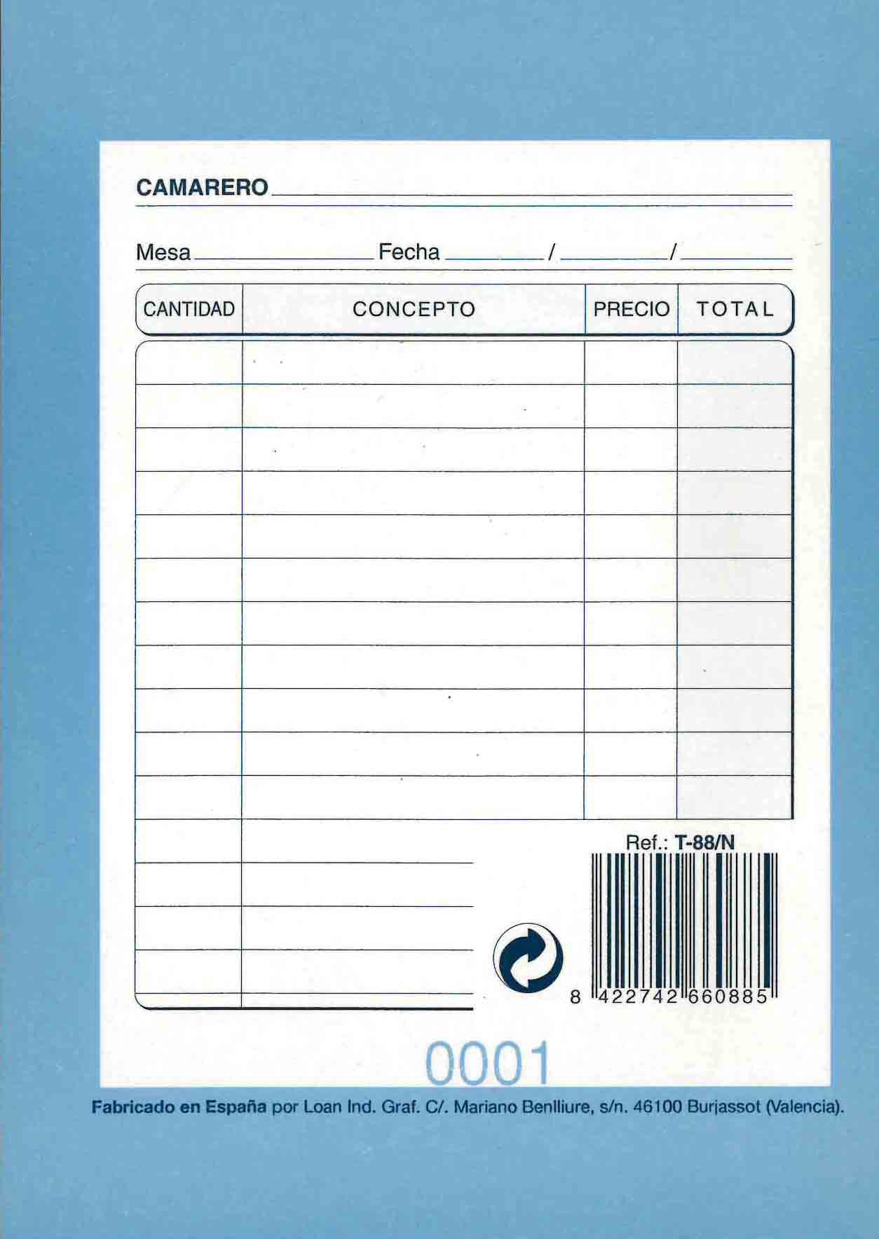 TALONARIO DE CAMAREROS TAMAÑO 8º CON COPIA Y ORIENTACION NATURAL CON 50 JUEGOS DE LOAN T88/N.