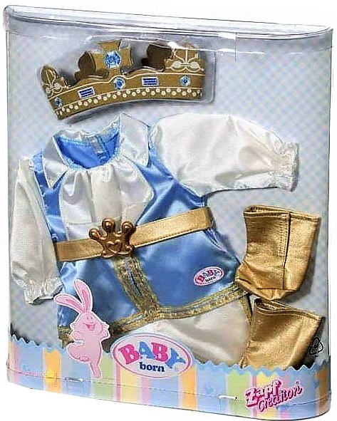 Con este set de ropita podrás vestir a tu muñeco Baby Born como si fuera un auténtico principe. Incluye un traje azul con cinturón, asi como unas botas doradas y su corona con purpurina.